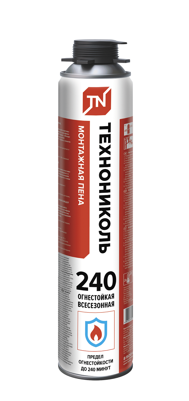 Огнестойкая монтажная пена ТЕХНОНИКОЛЬ 240 PROFESSIONAL соответствует нормам стандартам пожарной безопасности и обеспечивает защиту конструкций от прямого огня до 240 минут. Обладает высокой адгезией, обеспечивая надёжное сцепление с большинством поверхностей, включая бетон, металл, дерево, кирпич. Расход одного баллона составляет до 47 литров. После застывания материал не теряет своих свойств даже в условиях повышенной влажности.